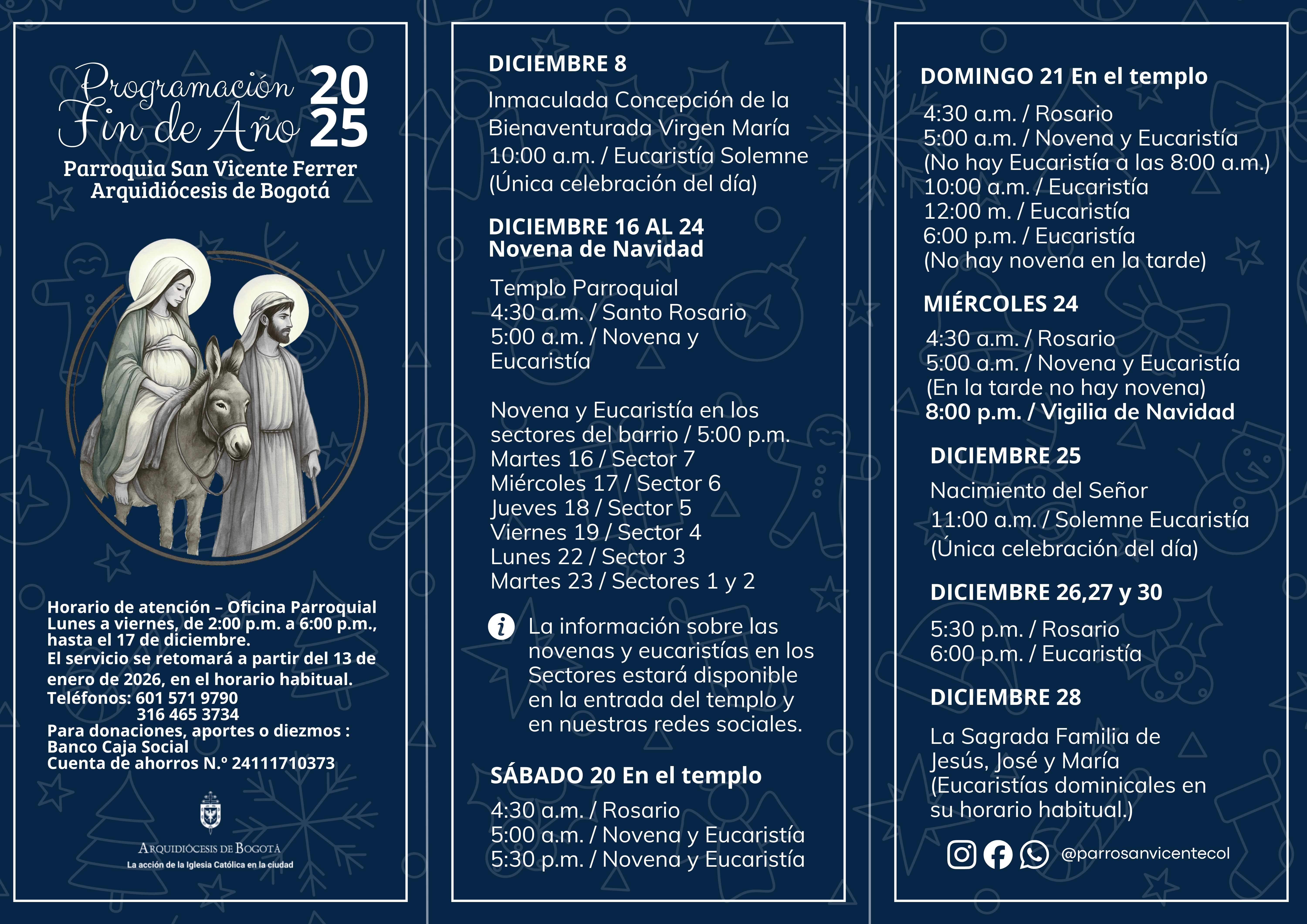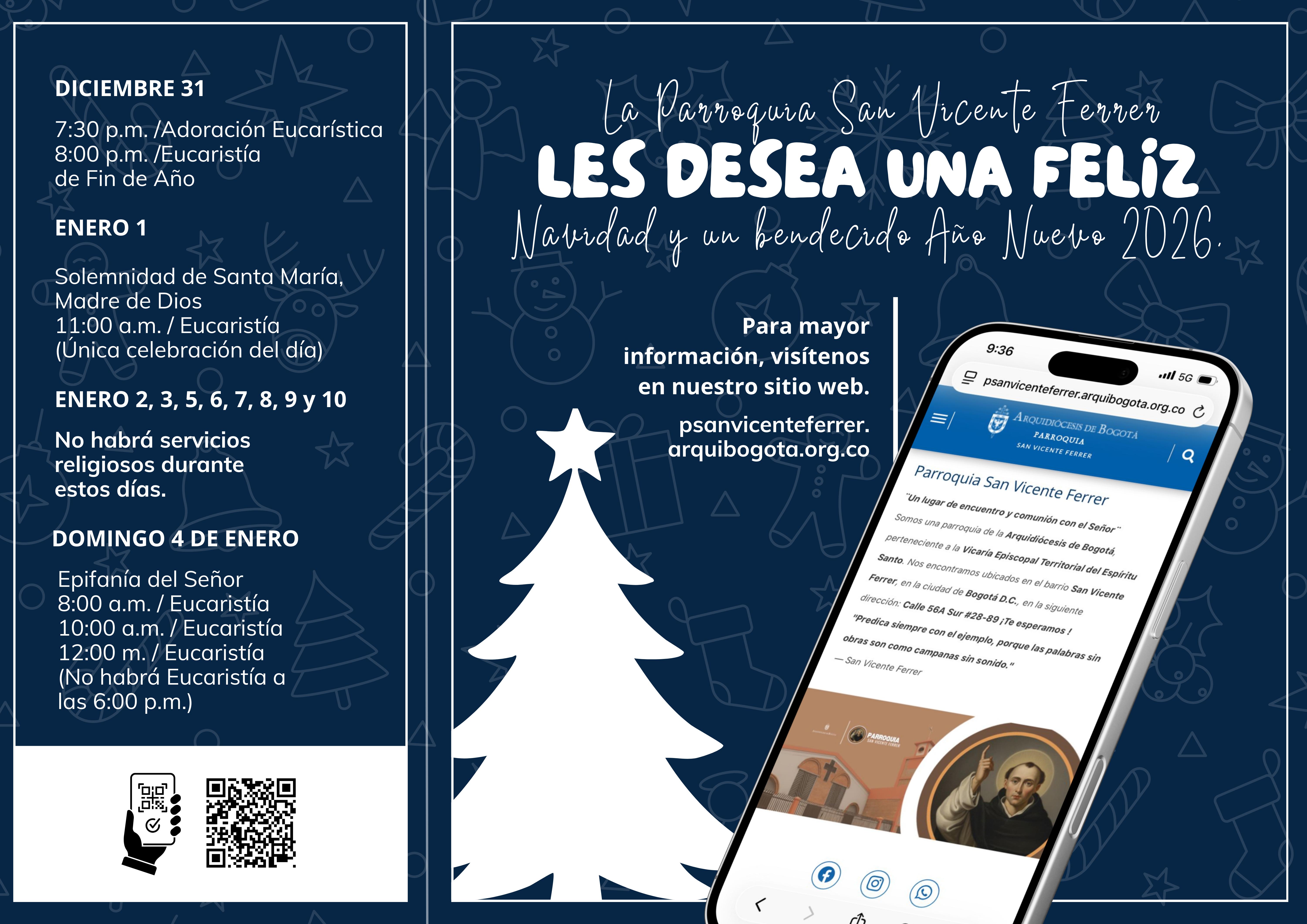 Desde la Parroquia San Vicente Ferrer compartimos la programación de fin de año. Les deseamos una Feliz Navidad y un bendecido Año Nuevo 2026.